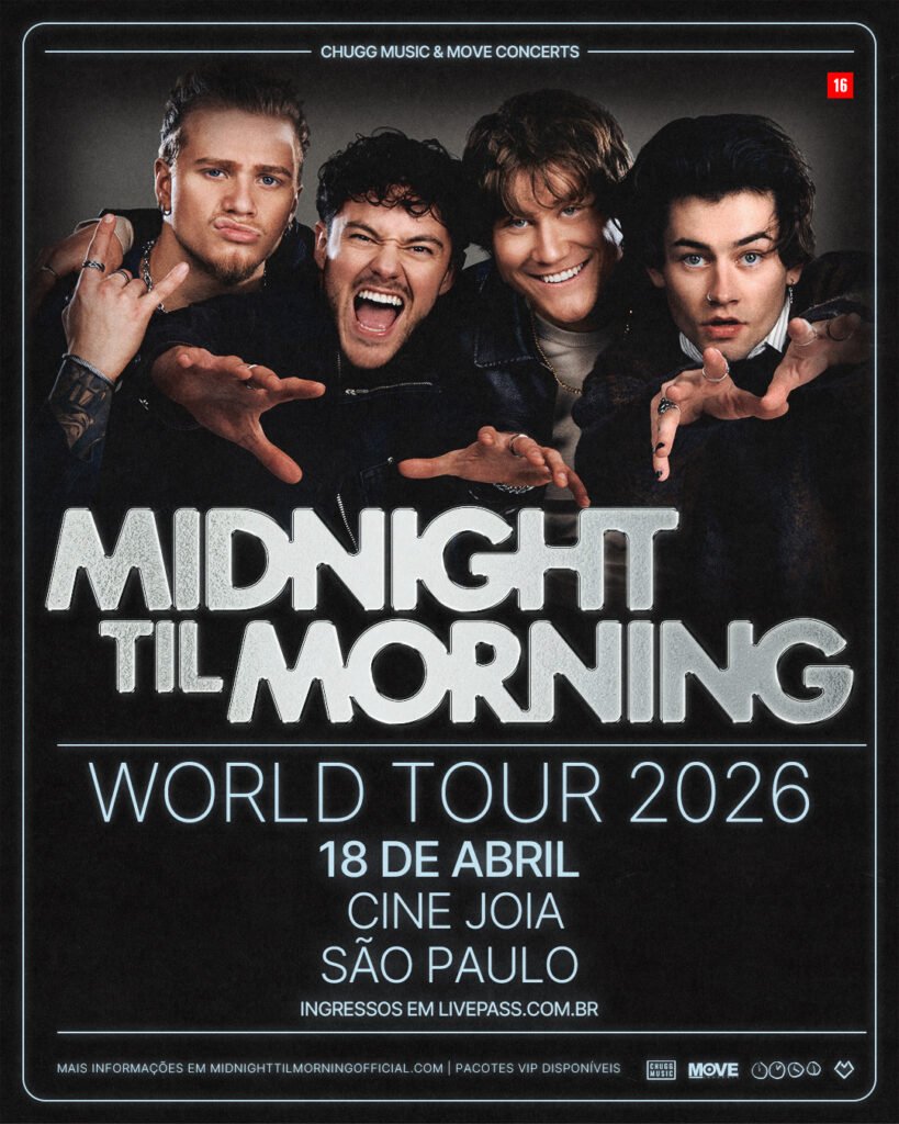 Das telas ao palco, Midnight Til Morning é uma banda transatlântica de pop rock formada em tempo real no programa Building the Band, da Netflix. Reunidos por meio de audições às cegas, os australianos Conor Smith (22) e Mason Watts (25) uniram forças com os americanos Shane Appell (22) e Zach Newbould (22), ganhando rapidamente a atenção do público em todo o mundo por sua química no palco e harmonias perfeitas. Vindos de carreiras solo, os quatro trazem seus diferentes estilos para um som colaborativo, misturando hinos pop e rock modernos. Seu single de estreia, “Bye” — co-escrito com compositores de sucesso por trás de artistas como Benson Boone, Harry Styles, Sabrina Carpenter e Shawn Mendes, marcou o início do que já se configura como um ano de grande sucesso para o grupo. No Brasil, MTM fará apresentação única dia 18 de abril de 2026, sábado, no Cine Joia. A realização é da Move Concerts Brasil.