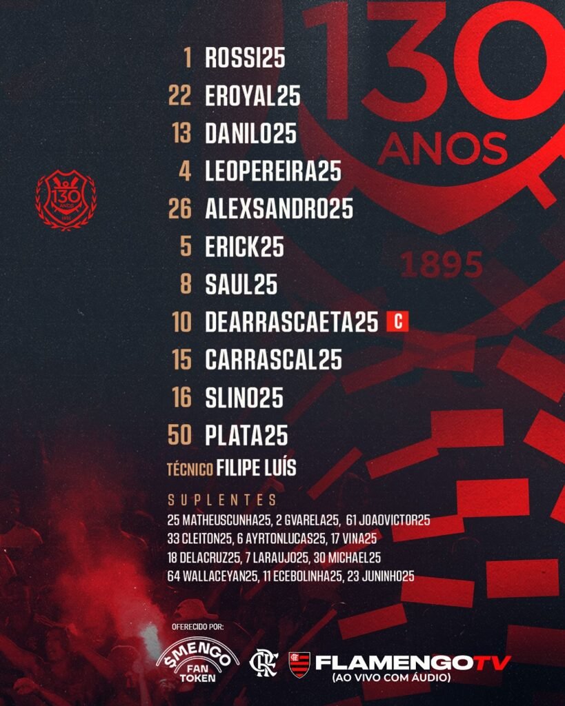 Flamengo: Rossi (1), Emerson Royal (22), Danilo (13), Leo Pereira (4), Alex Sandro (26), Erick Pulgar (5), Saul (8), Arrascaeta (10), Carrascal (15), Samuel Lino (16) e Plata (50).